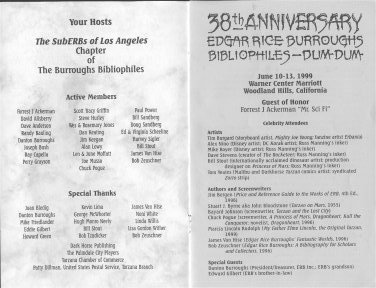 SubERBs of Los Angeles Chapter of the Burroughs Bibliophiles for hosting a fantastic weekend: The 38th Anniversary ERB Dum-Dum A special thanks to Scott Tracy Griffin and to Jim Van Hise, Bob Zeuschner, and Joan Bledig ...and... Forest J. Ackerman ~ Danton Burroughs ~ Mike Friedlander ~ Eddie Gilbert ~ Howard Green ~ Kevin Lima ~ George McWhorter ~ Hugh Monro Neely ~ Bill Stout ~ Bob Tzudicker ~ Noni White ~ Linda Willis ~ Lisa Gordon Wither ~ Dark Horse Publishing ~ The Palmdale Players ~ Tarzana Chamber of Commerce ~ Tarzana Post Office ~ Tarzana Bank of America ...and... The many celebrity artists, authors, screenwriters and ERB fans in attendance. |