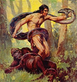 Yet, here in Lord, Tarzan remains loyal to the brute over man. The situation is so strange that one is inclined to read it in a symbolic way rather than just assuming it another example of Burroughs' pulp fiction extravagance. Just as the gorilla has escaped the bullet of a rifle, it is attacked by a snake. When Tarzan appears on this scene "he saw the huge brute beset by two of the natural enemies of both the Mangani and the Bolgani, there flared within his breast a sudden loyalty that burned away the personal prejudices of a lifetime."