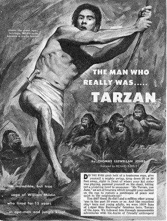 But the actual character, the person on whom the entire series was based, did live. There really was a man, an English nobleman, who, shipwrecked on the jungle coast of Africa, was cared for by the apes, grew up with them and eventually survived a thousand adventures before returning to London to assume his rightful title and position. The man was William Charles Mildin, 14th Earl of Streatham. For 15 years, between 1868 and 1883 his life was the prototype of Tarzan. Although many of the details were unknown at the time, the broad outlines of his story were fully known to the public. The "London Times" published several articles on the noble Earl. And more romanticized versions of his adventures appeared in several of the English illustrated papers and magazines of the late 19th century. Edgar Rice Burroughs had ample opportunity to study these stories before creating his own character. And the similarities between Lord Streatham's sojourn in Africa and Tarzan's, are too many to be merely coincidental. All this came to light rather recently. For the existence of a 50-year-old story in the files of old newspapers was not even noticed when the first Tarzan novels appeared. It wasn't until late 1957, some 74 years after the event, that the spotlight was first thrown on the entire affair. It came about almost accidentally. And since that time, the family solicitors of the Mildins have made every effort to hush the story up. There was no hint of the unusual when lord Edwin George Mildin, the 15th Earl, died in September 1937. His Lordship had no heirs and so it was not considered surprising when the huge family estate was bequeathed largely to charity. There was a proviso in the testament requiring that all family papers be kept secret, under lock and key, 20 years following the Earl's death. But that was normal too. Many people prefer to keep the details of family history quiet until all living participants have |