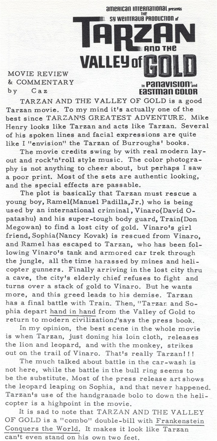 TARZAN AND THE VALLEY OF GOLD was also published in novel form by the great Fritz Leiber, the first time a writer other than Edgar rice Burroughs was allowed to do a book with the Ape Man. At 317 pages, the book deserves a thorough review someday. Leiber modifies his usual playful style, telling a headlong adventure tale that is more complex and sophisticated than the movie. I especially enjoyed the way Lieber sprinkled many references to Tarzan's classic ERB adventures, and the way he speculated on the Ape Man's longevity. It's too bad this book is so hard to find.