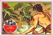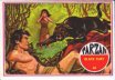 56. DUNGEON DUEL: From the shadows of a dark dungeon corridor an iron figure lunged at Tarzan. The armor-clad assassin was no match for the cat-like Ape-Man. With one tremendous blow, Tarzan knocked his attacker unconscious, then raced through the castle to freedom. Tarzan was unharmed!