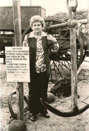 Rachel Martindale, curator, Cassia County Museum, Burley, Idaho, with anchor from the Burroughs family gold-dredging houseboat. |