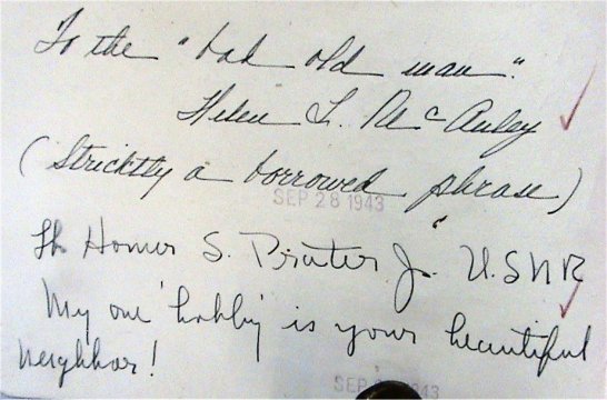 September 28, 1943 To the "bad old man." (Stricktly a borrowed phrase) ~ Helen L. McAuley My one 'hobby' is your beautiful neighbor! ~ Lt. Homer S. Pruter, J. - USNR