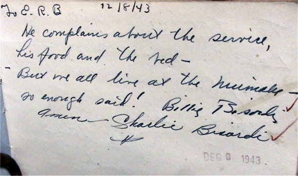 December 8, 1943 To E.R.B.: He complains about the service, his food and the bed -- But we all live at the Niumalu -- so enough said! ~Billy Bisardi Amen ~ Charlie Bisardi