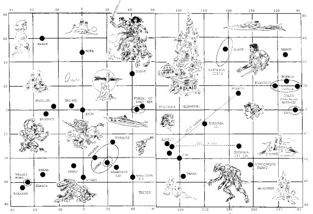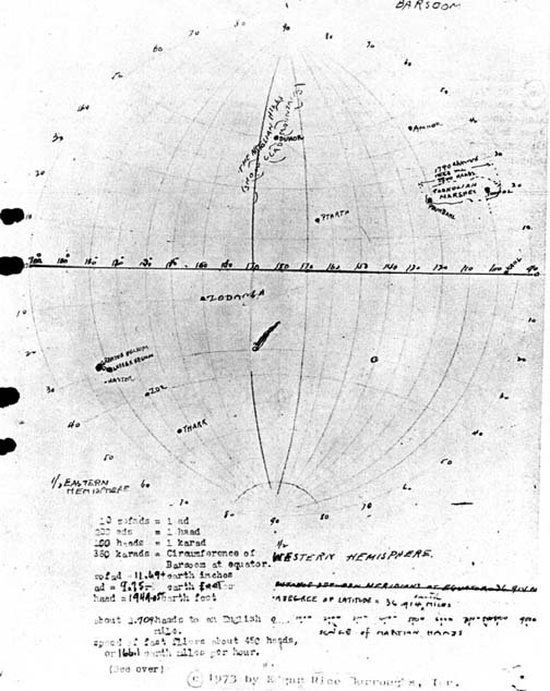 The Ferrier map accurately positions Ptarth and Zodanga -- an extremely difficult task -- along with the milage (distances) from Helium. Actually ERB changed Zodanga's position twice! Mr. Ferrier used an Earth globe for some distances, taking into account that Mars is only about half our planet's circumference - then transfered haads/miles to a rectangular grid - as ERB's own map indicated. A close look at ERB's sketchy Barsoom map will show where he made a few mistakes and then sought to rectify them -- such as around Lothar and Zodanga. |
