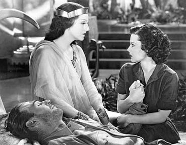 She addresses the corpse in a fairly demented way. Twenty-two hundred years of this would drive anybody nuts. Finally to the dismay of Holly she animates the body by telekinetic powers actually causing it to stand zombie like so she can kiss and caress it. A lot of necrophilia in this novel. Haggard must have been half dotty when he wrote this. Of course Kallicrates is a double of Leo so Holly has all he can do to keep from crying out. Causing the dead man to lay himself down Ayesha covers him and blows out the light.