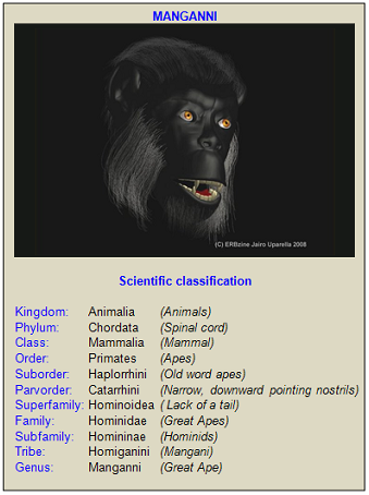 Blending fiction with science and based on drawings provided by various comic artists, we have described below, from the standpoint of physical and behavioral, the Mangani's characteristics. We can then say, and by current scientific illustration that they are from genus: manganni (great-ape), family hominidae (great apes), phylum: chordata (spinal cord), class: mammalian, order: primates, superfamily: hominoidea (primate monkeys without tails).