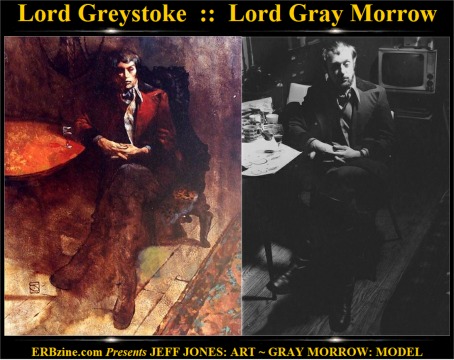 This is the ultimate Tarzan painting. Here Jones obviously echoes the famous Arting silhouette, which remains one of the finest renditions because of its dark, illusive portrayal so necessary to grasp Tarzan's true nature. Yet, Jones' vision is so superior that it nearly erases the power of the original.Jones' Tarzan so fills the frame that he overflows in all directions but one, the direction he is facing. The pose of the legs is similar to Arting, but where Arting's Tarzan is relaxed and almost effete with his dangling leg and limp wrist on a little branch barely large enough to bear the weight of his hand, Jones has given us a block of human power and majesty. Tarzan's thighs have become Burroughs' mighty thews instead of the skinny pipe stems of Arting.