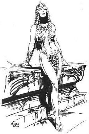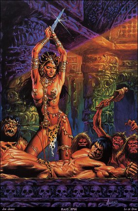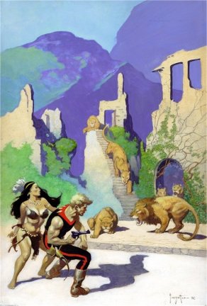 La of Opar was High Priestess of the lost Atlantean colony of Opar in ERB's Tarzan series. The women of Opar were beautiful, while the men were degenerate and bestial, partially because of breeding with the local Mangani. La was cold, haughty and ruthless; she nearly sacrificed jane Porter in The Return of Tarzan. Terribly jealous repeatedly vied for Tarzan's affection, but was forever spurned; Greystoke was committed to one woman only, much to her chagrin. The Frazetta pic of the girl with the lioness may not be intended to depict La, and the lost city in the distance may not be Opar, but there is certainly a resemblance. ![]()