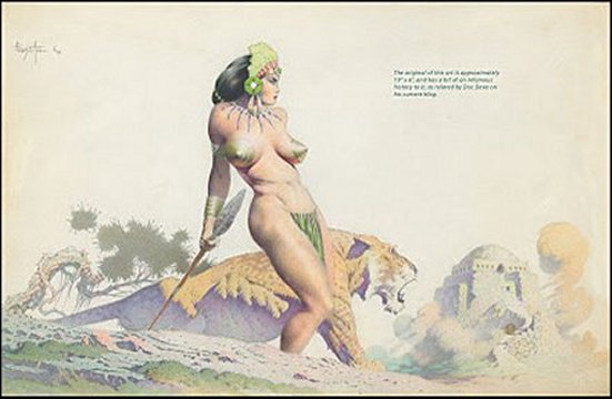 Nemone was the proud, cruel queen of Cathne, the city of gold, in the hidden valley of Onthar. She had a desire for Tarzan, but of course, she could never have him. The above risqué depiction by Frazetta may not be Nemone, but then again, it might. The lion could very well be Belthar, Nemone's faithful pet. Lions were used as guard beasts and to drive chariots in Cathne as well. .