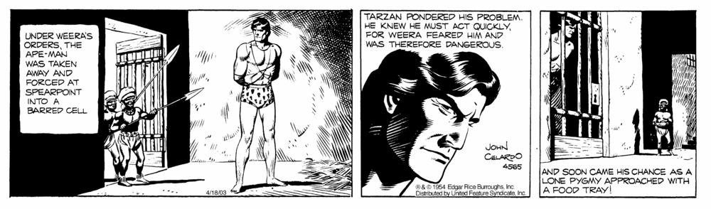 First and Only Weekly Online Fanzine Devoted to the Life and Works of Edgar Rice Burroughs Since 1996 ~ Over 10,000 Web Pages in Archive presents Volume 3810 TARZAN AND THE BLOOD RUBY 1954 ~ Strips 4535-4598 ~ 64 Days Art by John Celardo ~ Continuity by Dick Van Buren Part IV |
