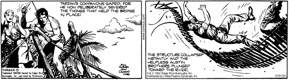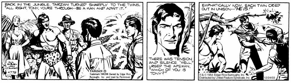 First and Only Weekly Online Fanzine Devoted to the Life and Works of Edgar Rice Burroughs Since 1996 ~ Over 10,000 Web Pages in Archive presents Volume 3833 TARZAN AND THE ACTOR TWINS Strips 4731-4792 ~ 62 Days Art by John Celardo ~ Continuity by Dick Van Buren Part II: 4779-4792 |