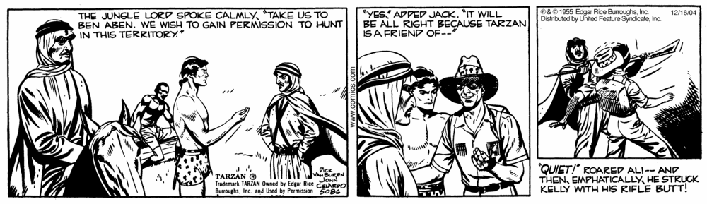 First and Only Weekly Online Fanzine Devoted to the Life and Works of Edgar Rice Burroughs Since 1996 ~ Over 10,000 Web Pages in Archive presents Volume 3859 TARZAN IN THE JUNGLE REVOLT Strips 5073-5148 ~ 76 Days Art by John Celardo ~ Continuity by Dick Van Buren Part II: 5085-5096 |