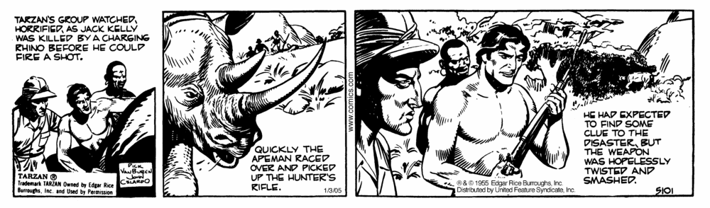 First and Only Weekly Online Fanzine Devoted to the Life and Works of Edgar Rice Burroughs Since 1996 ~ Over 10,000 Web Pages in Archive presents Volume 3860 TARZAN IN THE JUNGLE REVOLT Strips 5073-5148 ~ 76 Days Art by John Celardo ~ Continuity by Dick Van Buren Part III: 5097-5108 |