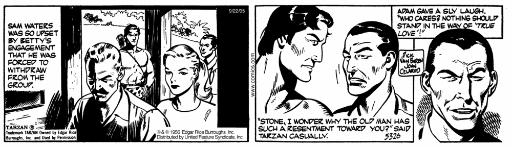 First and Only Weekly Online Fanzine Devoted to the Life and Works of Edgar Rice Burroughs Since 1996 ~ Over 10,000 Web Pages in Archive presents Volume 3879 THE COBALT CLAIM Strips 5288-5354 ~ 67 days Art by John Celardo ~ Continuity by Dick Van Buren Part IV: 5324 - 5335 |