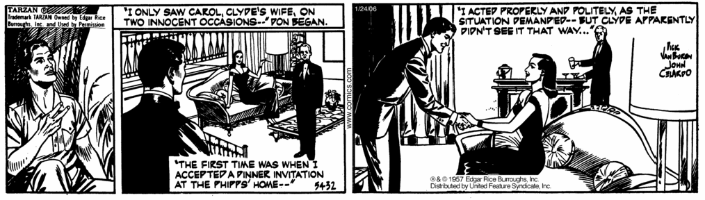 First and Only Weekly Online Fanzine Devoted to the Life and Works of Edgar Rice Burroughs Since 1996 ~ Over 10,000 Web Pages in Archive presents Volume 3888 TARZAN AND THE BABOON BOY Strips 5421-5480 (60 days) Art by John Celardo ~ Continuity by Dick Van Buren Part I: 5421 - 5432 |