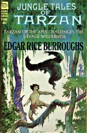 Tarzan's First Love. Tarzan's courtship of the female ape Teeka ends in failure when her preference turns to their mutual friend, the male ape Taug. The Capture of Tarzan. Tarzan is taken captive by the warriors of a village of cannibals which has established a village near the territory of the ape tribe. He is saved from them by Tantor, the elephant. The Fight for the Balu. Teeka and Taug have a baby (balu, in the ape language), which Teeka names Gazan and will not allow Tarzan near. She changes her mind after Tarzan saves the baby from another ape. The God of Tarzan. Tarzan discovers the concept of "God" in the books preserved in the cabin of his dead parents, to which he pays regular visits. He inquires among members of his ape tribe for further elucidation without success, and continues his investigation among the cannibals of the nearby village and the natural phenomena of his world, such as the sun and moon. Eventually he concludes that God is none of these, but the creative force permeating everything. Somehow, though, the dreaded snake Histah falls outside this. Tarzan and the Black Boy. Jealous of Taug and Teeka's relationship with their baby, Tarzan kidnaps Tibo, a little boy from the neighboring village to be his own "balu." He tries with indifferent success to teach the terrified and homesick child ape ways. Meanwhile, Momaya, Tibo's mother does everything she can think of to find and recover her son, even visiting the hermit witch-doctor Bukawai, a terrible, diseased exile who keeps two fearsome hyenas as pets. He names a price for recovering Tibo she cannot afford, and she leaves disappointed. Afterwards, however, Tarzan, who is moved by Tibo's distress and his mother's love, returns the boy to her. The Witch-Doctor Seeks Vengeance. Bukawai attempts to claim credit for Tibo's return and extort payment from the boy's mother, but is rebuffed. He plots vengeance against the native family and Tarzan, but is thwarted by the ape man. The End of Bukawai. Bukawai, finding Tarzan unconscious after a storm, takes the ape man captive and stakes him out for his hyenas to devour. Escaping, Tarzan leaves the witch doctor in the same trap, in which Bukawai suffers the very fate he had intended for his enemy. The Lion. Tarzan vainly attempts to impress on his ape tribe the necessity of maintaining a strict watch against the hazards and perils surrounding them. To drive home the lesson, he dons the skin of a lion he has killed and suddenly appears among them, only to find them more vigilant than he had thought, as they mob him and nearly beat him to death. He is saved only by the courage of his monkey friend Manu, which he had also previously under-rated, who risks all to reveal to Teeka and Taug that the "lion" is actually Tarzan. The Nightmare. Having been unsuccessful hunting, Tarzan robs the native village of some rotten elephant meat, which he eats. Becoming ill from the tainted meal, he has a horrible nightmare, in which he dreams himself menaced by a huge snake with the head of the village's witch doctor and is carried off by a giant bird. Waking, he realizes the incidents were not real. Subsequently attacked by a gorilla, he assumes that this too is a product of his fevered imagination, until actually wounded and hurt. He kills the beast, but is left to wonder what is real and what is fantasy. The only thing he is certain of is that he will never again eat the meat of an elephant. The Battle for Teeka. Discovering bullet cartridges in his deceased father's cabin, Tarzan takes them with him as curios. Subsequently, Teeka is taken by an ape from another tribe, and Tarzan and Taug join forces to trail the kidnapper and rescue her. When they catch up they are surrounded by the enemy tribe and nearly overwhelmed, until Teeka starts the cartridges at their foes in an apparently futile effort to help. When some of them hit a rock, they explode, frightening the hostile apes and saving her "rescuers." A Jungle Joke. As part of his campaign of torment and trickery against the native village, whose members he holds responsible for his ape foster mother's death, Tarzan captures Rabba Kega, the local witch doctor, and puts him in a trap the natives have set to catch a lion. The next day the warriors find they have caught the lion, but it has killed the witch doctor. They take the lion to the village. Tarzan secretly releases it and appears among them dressed in the lion skin he had previously used to trick the apes. Dropping the disguise, he reveals himself and leaves. When the natives muster enough courage, they follow, only to encounter the real lion, which they assume is Tarzan in his disguise again. They are quickly disabused. Tarzan Rescues the Moon. Tarzan frees a native warrior the apes have caught on being impressed by the man's bravery, angering the rest of the ape tribe. Alienated, he exiles himself to his parents' cabin. Later, frightened by an eclipse in which darkness appears to devour the moon, they summon him back. Tarzan reassures them by shooting arrows at the "devourer," and as the eclipse passes is given credit by the creatures for the "rescue." According to Tarzan Alive, Philip José Farmer's study of the ape man's life and career, the incidents of this book occurred from February, 1907-August, 1908 (aside from the eclipse incident, there apparently having been no such eclipse visible from equatorial Africa during this period). |