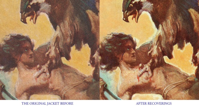 The image is dramatic, however it loses some of its presence by being reproduced in the small 5-inch by 7.5-inch area of the printed jacket. I worked from a very clean printer's proof loaned to me by a collector friend and scanned it at a high enough resolution as to be able to "connect the dots," so to speak, and bring out the details that were blurred by the halftone process. The larger, 11 by 17 art print size allows the figures of Tarzan and the bird to separate from the blob on the jacket while keeping the high space implied by the large amount of sky and clouds.