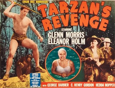 In 1938, producer Sol Lesser bought out his next sojourn into the world of Tarzan, Tarzan's Revenge. One of the benefits of feeding off the success of the bigger budget MGM Tarzan films was that certain successful elements could be taken from that series and put into these lower budget films. Examples of this were the portrayal of Tarzan as a generally non-verbal character, and the inclusion of Cheetah, Tarzan's chimpanzee side kick who never appeared in the books of Burroughs, but who first appeared in Tarzan the Apeman (1932). Also included was Tarzan's distinctive yell which, although having its roots in the books, became embodied in the studio manufactured call featured in the MGM movies and forever after copied by school boys swinging on ropes into rivers. In both Tarzan the Fearless and Tarzan's Revenge, Tarzan is generally non-verbal, has an unnamed chimpanzee sidekick that viewers familiar with the MGM series assume is Cheetah, as well as a cry that is reminiscent of, though simpler than, the one featured in the MGM series. Although each has continuity outside of the MGM movies story line, both Tarzan the Fearless and Tarzan's Revenge fit well into MGM's conception of the character.This stands in contrast to Burroughs's own cinematic production of Tarzan, The New Adventures of Tarzan (1933). This 12-part serial featured a chimpanzee sidekick named Nkima, based on a monkey character in the novels, but Tarzan is presented as a well-spoken and educated English Lord. The Tarzan yell was taken from the Tarzan radio show, which was very different from the MGM version. In addition to this, the film featured a word from Burroughs's fictional ape language, "tarmangani" (white ape). If Burroughs sought to bring his character to the screen authentically, Lesser's version of Tarzan was designed to go with the cinematic flow created by the MGM talky Tarzan films that had proven so popular with the cinema going audience of the 1930s. Since the MGM movies featured the Olympian Johnny Weissmuller as Tarzan, Lesser's Tarzan's Revenge, in traditional showman style, would present not one but two Olympic gold medallists. Decathlete Glenn Morris took on the Tarzan role and swimmer Eleanor Holm starred, not as Jane, but as Eleanor. Lesser believed that Eleanor Holm was so well known by the public that they would never accept her as anyone else but Eleanor. When writing this over seventy years later, this seems ironic because my knowledge of Eleanor Holm comes not from her Olympic achievements, but from her portrayal as Tarzan's mate. Lesser surrounded the two inexperienced leads with a very experienced and professional back-up team. He hired capable B movie director David Ross Lederman, an experienced cast of character actors, Oscar-winning film editor Gene Milford, and a Robert Lee Johnson script that doesn't take itself too seriously. He commissioned a romantic and energetic score made up of original and stock music.