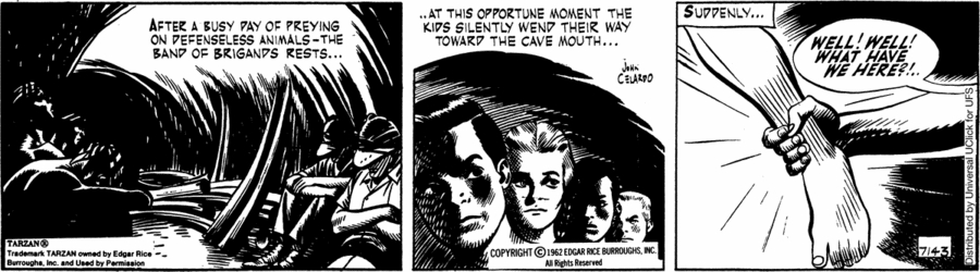 First and Only Weekly Online Fanzine Devoted to the Life and Works of Edgar Rice Burroughs Since 1996 ~ Over 10,000 Web Pages in Archive presents Volume 4448 Tarzan and the Poachers John Celardo/John Celardo ~ 7105-7236 ~ 132 days 7 May 1962-6 Oct. 1962 Part III: 7141 - 7152 |