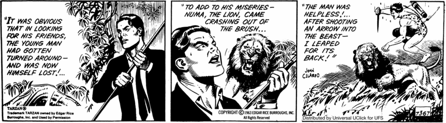 First and Only Weekly Online Fanzine Devoted to the Life and Works of Edgar Rice Burroughs Since 1996 ~ Over 10,000 Web Pages in Archive presents Volume 4466 Tarzan Tells His Story, Part 2 John Celardo/John Celardo ~ 7345-7396 ~ 52 days 11 Feb. 1963-11 Apr. 1963 Part II: 7357 - 7368 |