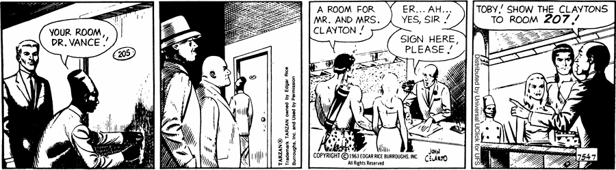 First and Only Weekly Online Fanzine Devoted to the Life and Works of Edgar Rice Burroughs Since 1996 ~ Over 10,000 Web Pages in Archive presents Volume 4483 Tarzan and the Oil Wells John Celardo/John Celardo ~ 7543-7610 ~ 68 days 12 Aug. 1963-28 Sept. 1963 Part I: 7543 - 7554 |