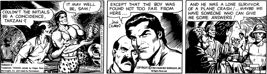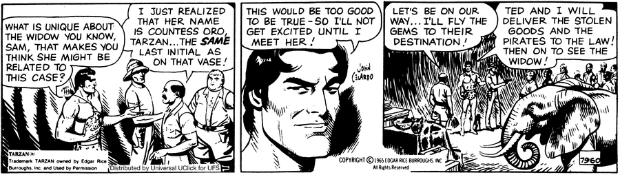 First and Only Weekly Online Fanzine Devoted to the Life and Works of Edgar Rice Burroughs Since 1996 ~ Over 10,000 Web Pages in Archive presents Volume 4623 Tarzan and the Sky Pirates John Celardo/John Celardo ~ 68 Episodes 146. 7893-7960 (11 Nov. 1964-28 Jan. 1965) Part VI: 7952 - 7963 |