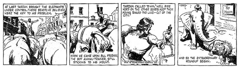 First and Only Weekly Online Fanzine Devoted to the Life and Works of Edgar Rice Burroughs Since 1996 ~ Over 10,000 Web Pages in Archive presents Volume 5413 Tarzan and Revolt of the Beasts Rex Maxon/Don Garden 36. 1057-1114 (10 Jan. 1943 - ) (588 days) Part I: Strips 1057 - 1068 |