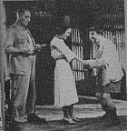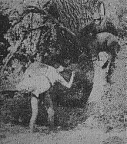 After a long time of silent staring, Tarzan made chewing noises with his mouth and pointed to the ground beneath, trying to tell Jane that he was hungry and that he would bring food. When the girl's smile told him that she understood, he swung rapidly through the treetops in search of food. A short time later, when he was returning with fresh meat form his kill, a strange sight met Tarzan's eyes. He crouched unseen against a tree trunk. Beneath his house stood the white and black men with long shiny sticks in their hands. A huge ape was standing on the branch beside Jane, snarling down at the men, protecting the girl in Tarzan's absence. Suddenly fire and noise burned from one of the shiny sticks and the ape fell screaming to the ground. Then Tarzan saw Jane slide into her father's waiting arms. He watched the safari rapidly push its way out of sight through the underbrush. Quickly Tarzan ran to the side of the fallen ape. A look of cold fury came into his blue eyes when he saw that the animal was lifeless. Gripping his knife, he set out in pursuit of the white men. He was going to avenge his friend of the jungle. Finally the safari reached its camp. Jane tried to explain to her father and Holt that Tarzan was not an animal, that he was a human being who had been kind to her. Startled by a faint noise, they looked up to see Tarzan and a huge ape poised in the branches above their heads. Parker and Holt reached for their guns but Jane stopped them. Slowly she walked forward until she stood beneath the branch where Tarzan and the ape were whispering together. Softly she called to Tarzan, asking him to come down. |