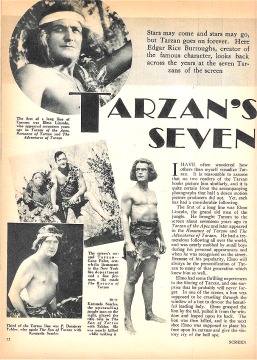 Seven Tarzans! Count 'em. Seven Tarzans and one son. In these seven have any of the producers visualized Tarzan as you visualize him? Perhaps not, but each of them has brought Tarzan to life and given us new thrills and a world of entertainment on the silver screen.