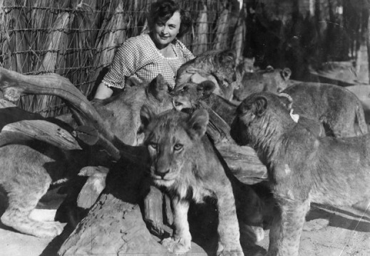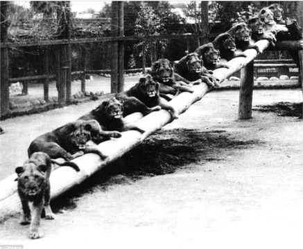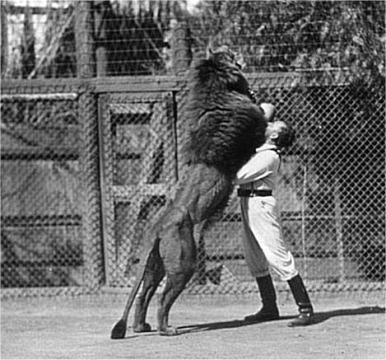 Needing more room for their animals, the Gays found a large plot of un-zoned property in El Monte, east of Los Angeles, where in 1925 they opened Gay's Lion Farm, a public attraction dedicated to the breeding, training and exhibition of African lions. The Farm quickly became one of the most popular tourist attractions in the Southland, doing a brisk trade in souvenir photographic postcards. Among the famous animals raised on the Farm were Metro-Goldwyn-Mayer Studio lions Slats (1924–1927, died of appendicitis and was stuffed) and his lookalike successor Jackie, and the celebrated comic lion Numa (1912–1930, died of cancer and was stuffed), named for the lion in the Tarzan books. Slats, Numa, and Jackie (the friendliest of the three) appeared as one lion in Charlie Chaplin's "The Circus" (1928). The 5-acre (2.0 ha) farm with its thatched roof, African-inspired architecture (a likely inspiration for Walt Disney's Adventureland), was a U-shaped compound, with separate cages for each adult cat, a nursery, and a central caged arena where Charles Gay, with whip and gun, performed a classic lion tamer act for the crowds. Feedings were also a big draw, with a ton of meat being consumed daily. In 1925, El Monte High School adopted the Lions name for its teams, and the Gays provided a lion mascot for big games. |