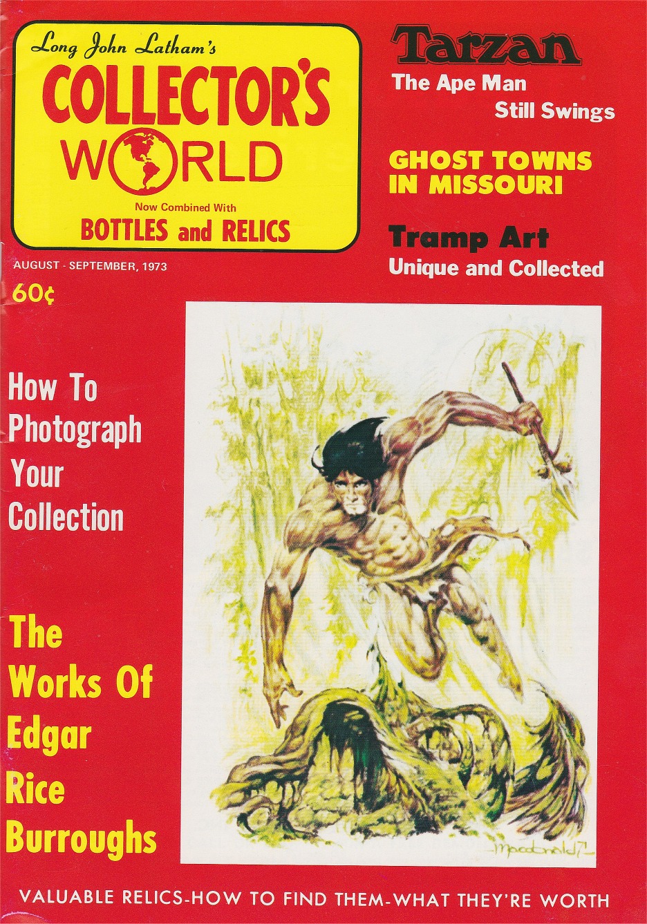 Caz with his awesome ERB collection, June 1972, Evergreen, CO.In 1973 I felt a need to write about my favorite hobby. The result was an article titled "The Works of Edgar Rice Burroughs" published in the August-September issue of Long John Latham's Collector's World magazine located in Conroe, TX. The article was an overview of Burroughs' writing, his continuing wide appeal, and a look at the various editions of his books with an eye to identification and current market value. The black & white photographs featured books from my personal collection, including several first editions I'd purchased from Caz the previous year. One of the photos, which showed a McClurg first edition of Tarzan, Lord of the Jungle in original dustjacket, ended up illustrating an accompanying article by James S. Hurst entitled "Tarzan The Ape Man Still Swings." This article highlighted the collecting of Tarzan movie memorabilia and the two articles combined well to make this a special ERB issue of Collector's World. To my surprise, the front cover of the magazine sported the eye-catching Tarzan art of Neal MacDonald, Jr. from the cover of ERB-dom #48, supplied by Caz. I can't praise this image enough. In my mind it's right up there with St. John, Frazetta, Krenkel, Foster, Hogarth, John Coleman Burroughs, and all the rest as a dynamic and unforgettable artistic rendering of Tarzan.