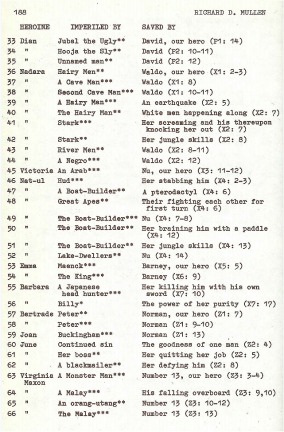The following table has been prepared as a service to serious students of literature and morality, and it is earnestly hoped that no reader will use it as an index to incidents that might appeal to his prurient interests. It covers all works written by the Master in the period 1911-1915, except H.R.H., the Rider, which I have been unable to consult. Other Burroughsiana may perhaps be induced to assist in extending this survey over the entire corpus. In this day of declining moral standards, nothing could be of greater importance.So that the ,reader may appreciate the full horror of the heroine's peril, the villain is designated by name only when his race is the same as hers, with exceptions allowed for the two Emperors or Abyssinia, whose high rank may be thought to offer some compensation.