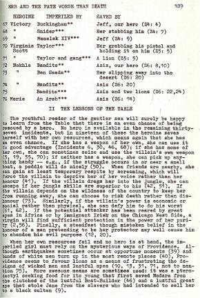 The youthful reader of the gentler sex will surely be happy to learn from the Table that there is an even chance of being rescued by a hero. No hero is available in the remaining thirty-seven incidents, but in nineteen of these the heroine saves herself with her own resources, which means again that she has an even chance. If she has a weapon of her own, she can use it to good advantage (Incidents 6, 30, 46, 68); if she has none of her own, she can sometimes seize and use the villain's own weapon (5, 19, 55, ?0); if neither has a weapon, she can pick up anything handy· -- e.g., if the struggle occurs in or near a small
