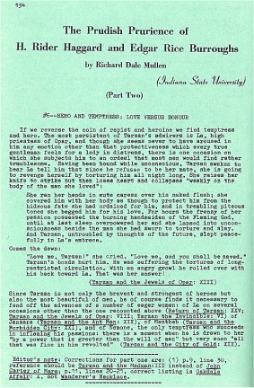 First and Only Weekly Online Fanzine Devoted to the Life & Works of Edgar Rice Burroughs Since 1996 ~ Over 15,000 Web Pages in Archive presents Volume 6679 The Prudish Prurience of H. Rider Haggard and Edgar Rice Burroughs Part Two Continued from Part One in ERBzine 6678 by Richard Dale Mullen Indiana State University ~ Terre Haute Riverside Quarterly, Vol. 6, No. 1, August 1973, pp. 4-19 From the David Sorochty Collection Scanned and Formatted for Web Display by Bill Hillman |
