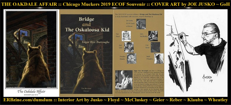 ERB's Jack London / H.H. Knibbs-inspired, selfless, poetry-spouting, hobo character, Bridge, makes another appearance in the novellete, The Oakdale Affair (original title, Bridge and the Oskalooska Kid. Joining the poetic hobo in this gothic-like tale are many other unusual elements: dark mysterious nights, a deserted haunted farmhouse, a violent thunderstorm, the Oskalooska Kid, a girl disguised as a boy, thieves and murderers, Beppo the bear in chains, and other surprises. This sequel to The Mucker, written between January 10 and June 12, 1917, was rejected by All-Story magazine but later published in the March 1918 edition of Blue Book. The story, along with H.R.H. The Rider, was eventually published in hardcover by ERB, Inc. on February 15, 1937. This was the first ERB novel illustrated by John Coleman Burroughs. He did the dust jacket painting and two interiors using his wife Jane Ralston Burroughs and brother-in-law James Pierce as models for the illustrations.