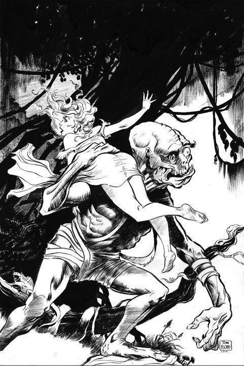 A bit later in the same chapter is a more complete description, and most of the different book illustrators over the years have done a faithful job of recreating this creature, although their imaginations and painting styles differ: "One eye was fully twice the diameter of the other, and an inch above the horizontal plane of its tiny mate. The nose was but a gaping orifice above a deformed and twisted mouth. The thing was chinless, and its small, foreheadless head surmounted its colossal body like a cannon ball on a hill top. One arm was at least twelve inches longer than its mate, which was itself long in proportion to the torso, while the legs, similarly mismated and terminating in huge, flat feet that protruded laterally, caused the thing to lurch fearfully from side to side as it lumbered toward the girl."