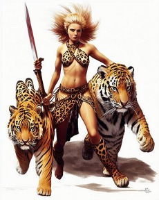 Here are two illustrations, one is the original pulp magazine cover and one is my artificial intelligence enhanced painting. I always hoped that after Victoria reawakened in the present, she’d remember her prehistoric past, train a couple of tigers, and search the world for Nu’s new incarnation, which brings us to today’s drabble, “Run With Tigers,” inspired by “Sweetheart Primeval” and my wish that Victoria found Nu and the two lived happily somewhere and somewhen.After living in her prehistoric incarnation, the pleasures of civilization held no attraction for Victoria Custer. She was determined to find the next incarnation of her stone-age lover, Nu, son of Nu. RUN WITH TIGERS
