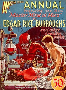 July 15, 2023: On this day in 1927, the first and only Amazing Stories Annual was published. Titled “Amazing Stories Annual Volume 1, the entire issue consisted of the novel, “The Mastermind of Mars” by Edgar Rice Burroughs and a group of selected reprints including “The Face in the Abyss” and “The People in the Pit’ by A. Merritt, “The Man Who Saved the Earth” by Austin Hall, “The Man Who Could Vanish” by A. Hyatt Verrill and “Under the Knife” by H. G. Wells. The cover and ten black and white interior illustrations were by Frank R. Paul. The iconic cover illustration of a scene in the laboratory of the mad scientist, Ras Thavas, has been recreated by several artists since Paul’s illustration. The cover price was a whopping fifty cents.