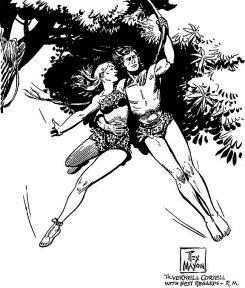 Care should also be taken in these instructions to the artist to prevent illustrating or describing flora or fauna not native to Africa or to Equatorial Africa. I learned after the crisicisms were made of the first Tarzan story to be more careful and although I mentioned pineapples in the first book, I doubt if I did so thereafter and you might as well profit by my mistakes. Incidentally, I might say that I put a tiger in Africa in the magazine version of the first Tarzan story, though I was careful to yank him out of the book version before it went to press. I usually dodge the issue by using generic terms rather than describing fruits and nuts specifically. It was always safe to assume that edible fruits and nuts grow in the forests, but I try to be careful not to mention bananas or coconuts specifically, since I am not at all sure that they grow in central Equatorial Africa.